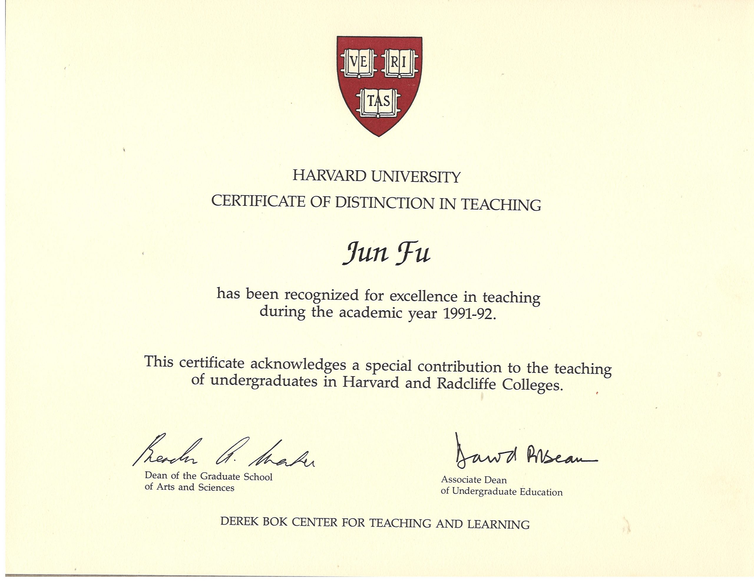 Dr. Jun Fu Was Awarded Certificate of Distinction In Teaching By Harvard University